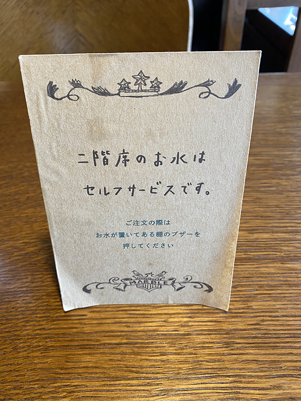 2階のお水はセルフです。注文する時のベルもお水の横にあります。