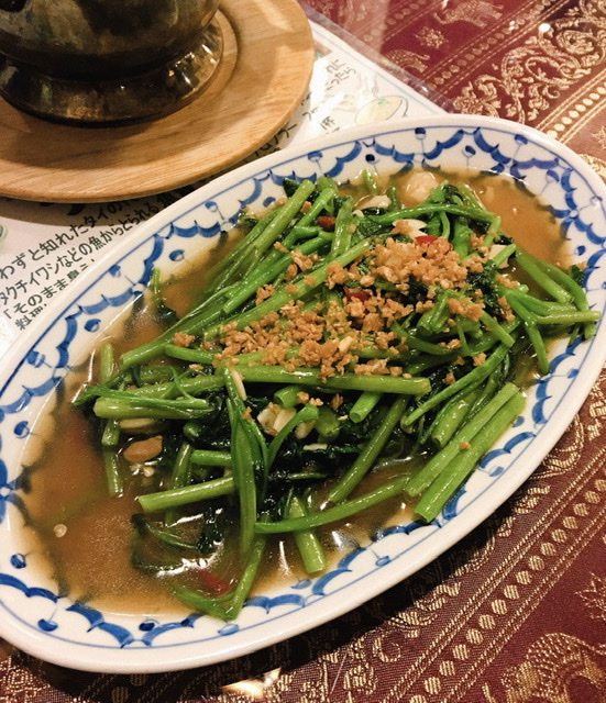 ニンニクの効いたピリ辛な味付けと、歯応えのある茎野菜(空芯菜)がとてもマッチしています!