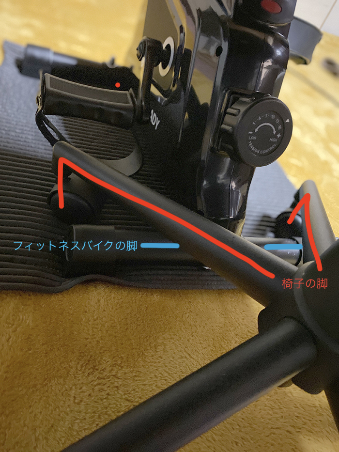 そこで、椅子の足をこのサイクリングの部分に引っ掛けて漕いでみました。